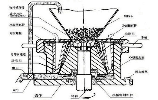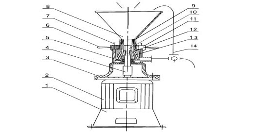 9.進(jìn)料通道 10.旋葉刀 11.調(diào)節(jié)盤 12.靜磨盤 13.動磨盤 14.循環(huán)管