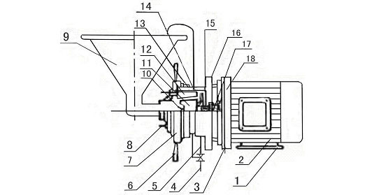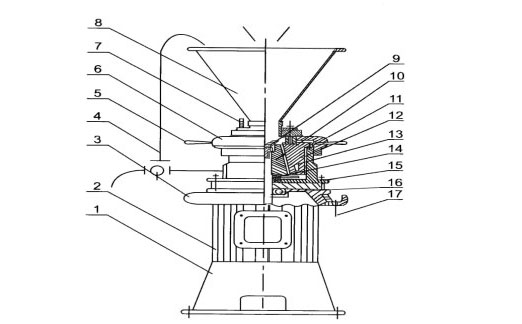 9.加料斗 10.旋葉刀 11.動磨盤 12.靜磨盤 13.刻度 14.O型圈 15.機(jī)械密封