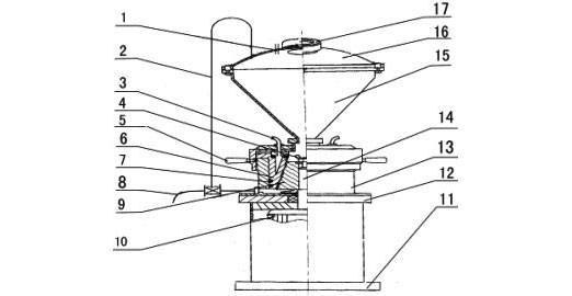 8.加料斗 9.旋葉刀(動磨盤緊固螺紋) 10.動磨盤 11.定位螺釘 12.靜磨盤